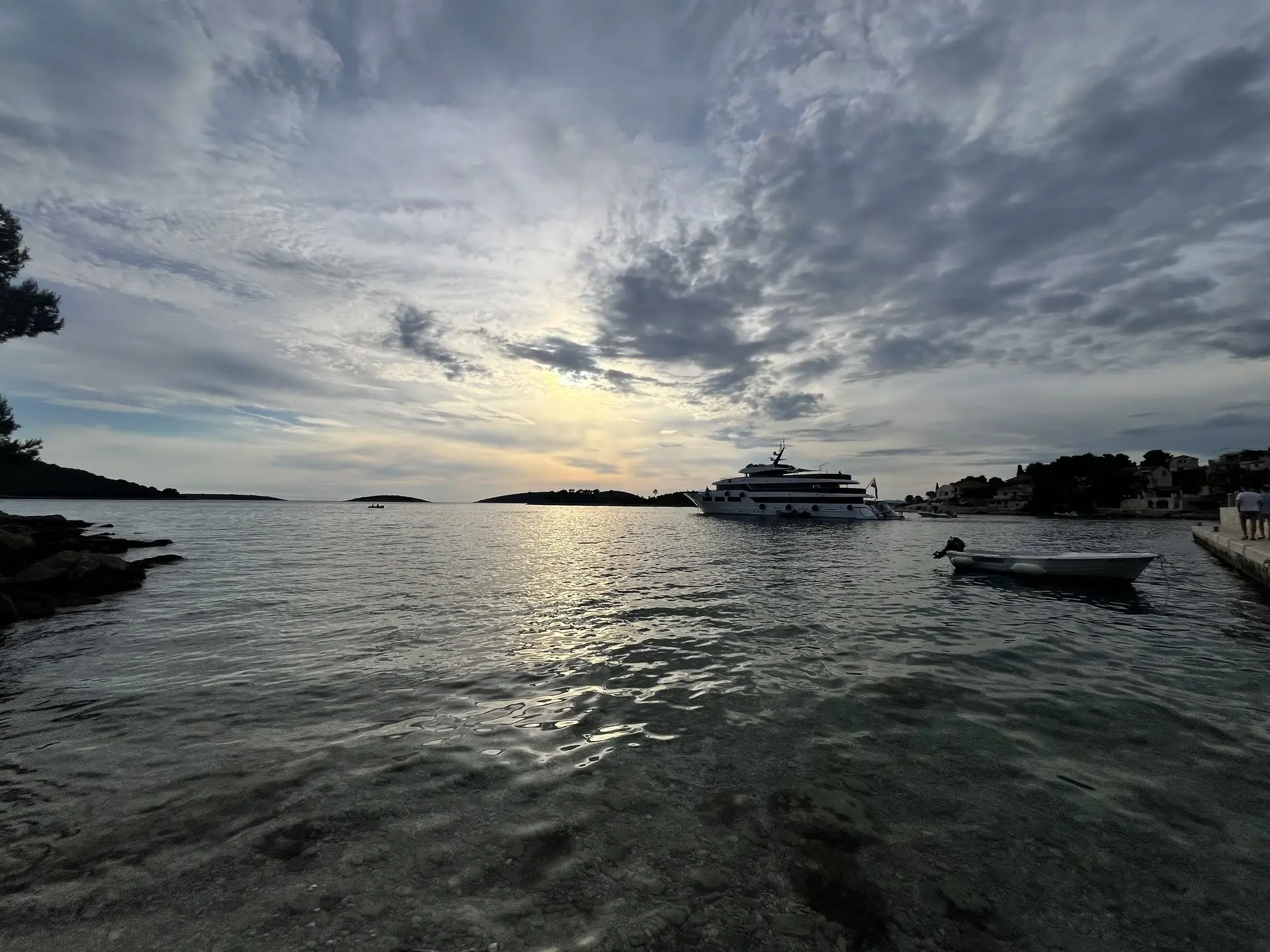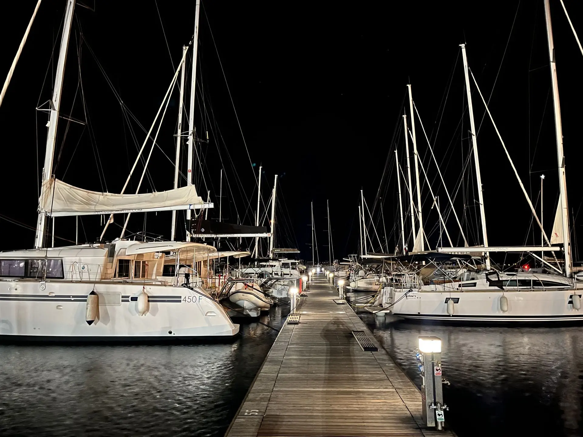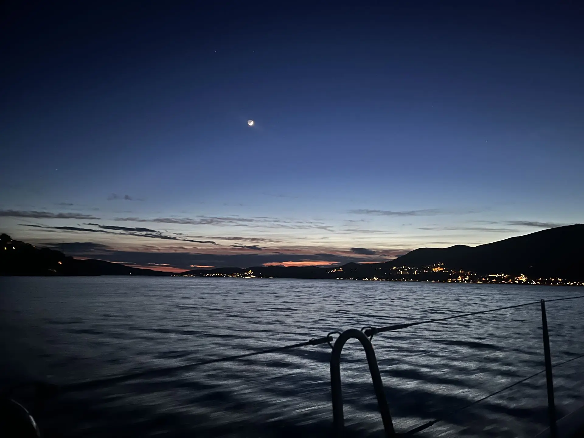 V zátoke sme sa naobedovali, vyrazili sme smerom do Trogiru natankovať nádrž lode a naplniť aj 20l bandasku. Následne, keď sa opäť rozfúkal vietor, zakotvili sme v zátoke oproti, navečerali sme sa zo zásob a čakali sme, kým príde večer. Keď padla noc, vyrazili sme na nočnú plavbu do domovskej maríny Kaštela.