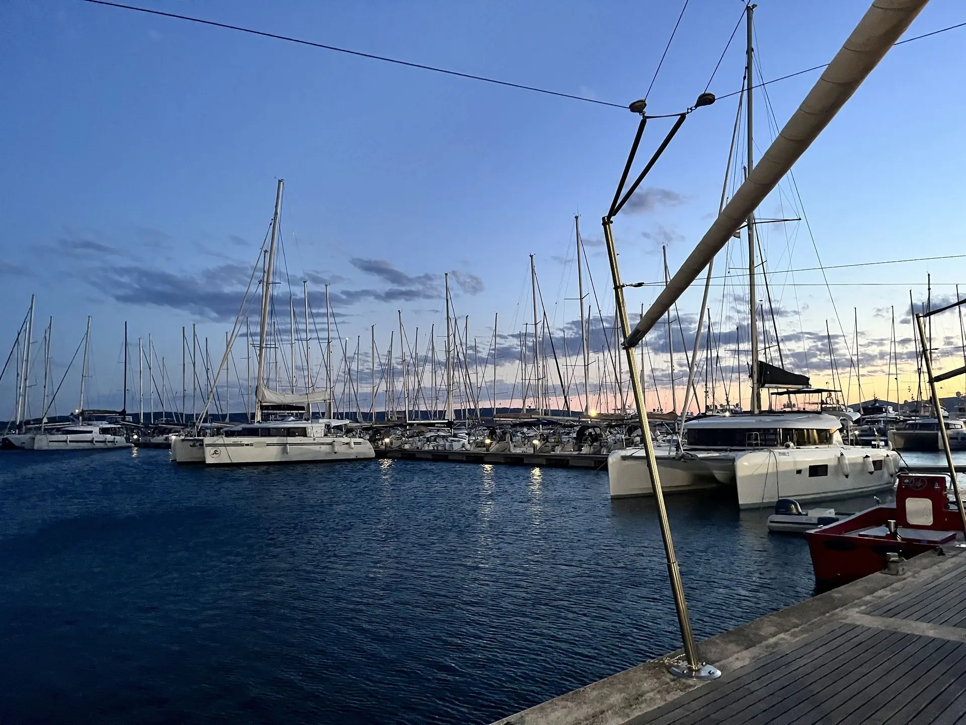 Po príchode okolo 18tej hodiny sme si dali prvé stretnutie celej posádky a nášho inštruktora, spravili si malý briefing, priniesli sme veci k lodi, nalodili sa, rozdelili kajuty, prvý bezpečenostny brífing, išli nakúpiť a večeru sme mali v miestnom podniku.